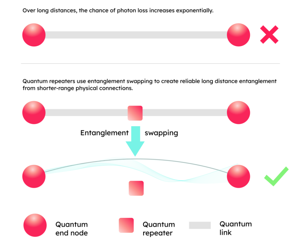 양자 리피터를 이용한 얽힘 스와핑(entanglement swapping) 개념도. 긴 거리의 두 노드(빨간 구체) 간 직접적인 양자 연결은 광자 손실 때문에 실패(위, 빨간 X)하지만, 중간에 양자 리피터(분홍 노드)를 두고 여러 구간으로 나누어 얽힘을 생성한 뒤 스와핑으로 연결하면 장거리 얽힘 공유에 성공할 수 있다(아래, 초록 체크표시).