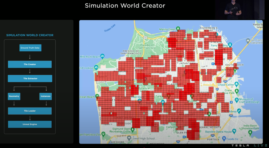 테슬라가 AI Day 2022에서 공개한 시뮬레이션 시스템은, Simulation World Creator 파이프라인을 통해 실제 지형·도로(Geometry), 객체(Instances)를 “Tile” 단위로 구성하고, Unreal Engine 상에서 Ground Truth Lane Graph와 환경 데이터를 실감 나게 재현하는 방식입니다. 또한 Ground Truth Alternation 기법으로 이미 구축된 세계를 다양한 파라미터로 변형해, 자율주행 알고리즘이 폭넓은 시나리오를 학습·검증할 수 있게 합니다.
