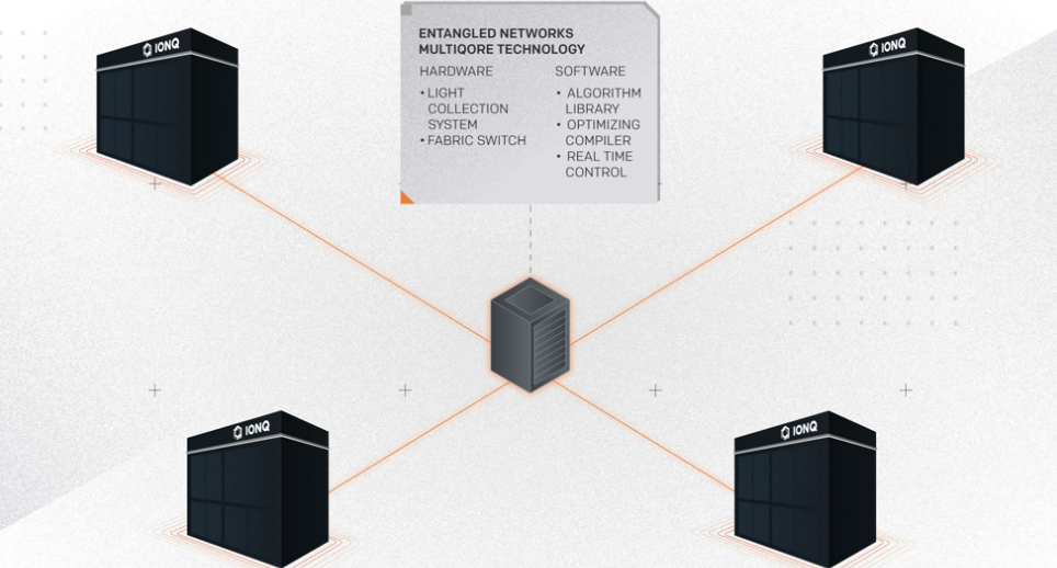 Entangled Networks의 멀티코어 양자컴퓨팅 개념도: 다수의 IonQ 양자컴퓨터를 광학 네트워크로 연결하여 하나의 시스템처럼 동작시키는 구조를 묘사한 그림ionq.com.