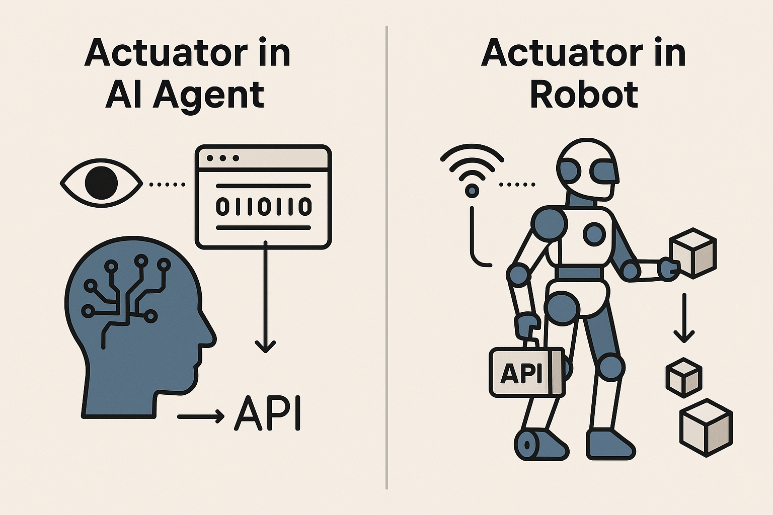 정리하자면, 로봇 공학에서의 액추에이터는 실제 물리적 동작을 통해 환경에 영향을 주는 장치이며, AI 에이전트(특히 소프트웨어 에이전트)에서의 액추에이터는 물리적 활동 대신 환경(데이터나 정보 체계)에 변화를 야기하는 ‘행동 실행 수단’으로서 주로 비물리적이고 정보 중심적인 방식으로 나타납니다.
