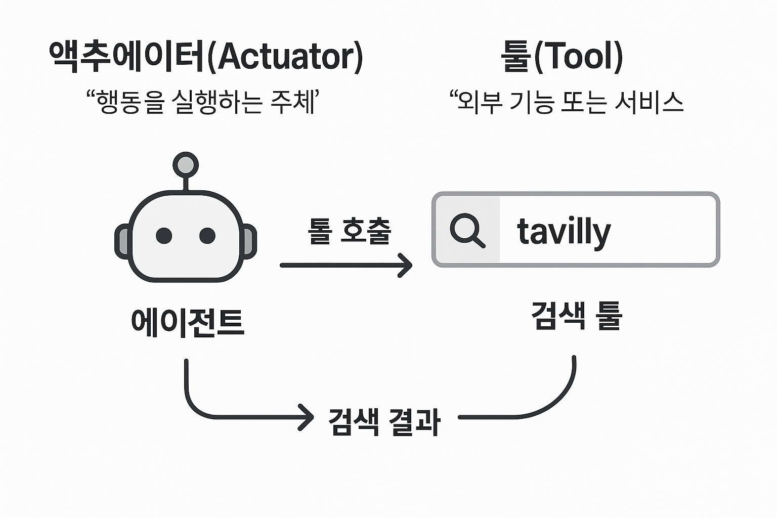 3. 툴 → ‘tavlily 검색 서비스’가 검색 결과를 반환 여기서 액추에이터는 “행동을 실행하는 주체”이고, 툴은 “그 행동을 통해 접근하려는 외부 기능”입니다. 에이전트 입장에서는 자신이 가진 액추에이터를 통해 툴을 호출하고, 그 응답을 받아 다음 의사결정에 활용합니다.